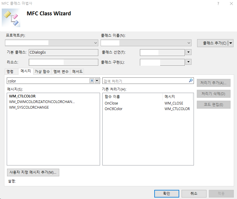 메시지 탭에서 WM_CTLCOLOR 를 선택 후 처리기를 추가합니다