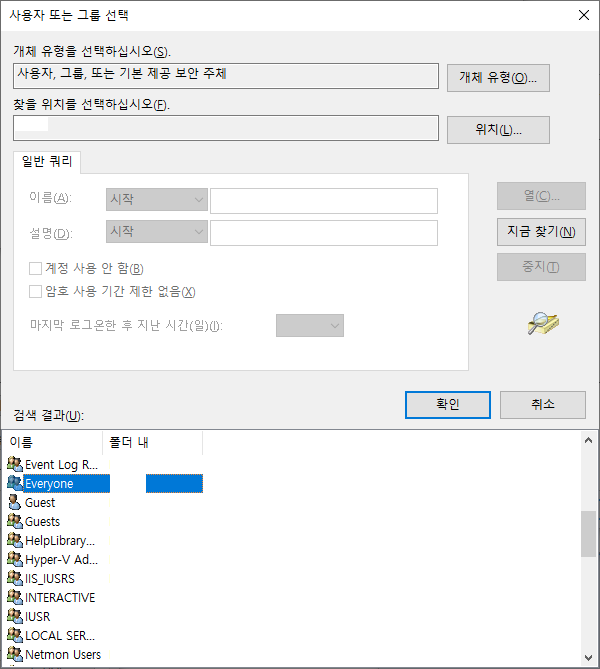 5. 검색 결과에 나온 사용자를 선택해서 확인을 누릅니다 (필자는 Everyone을 선택했습니다)