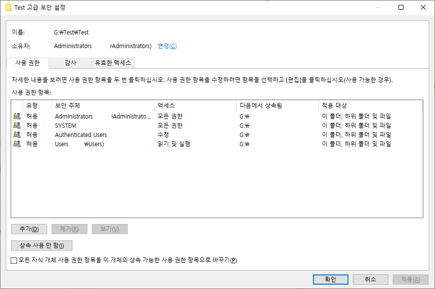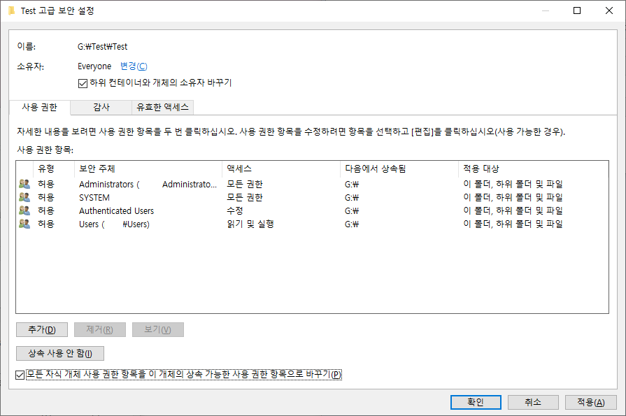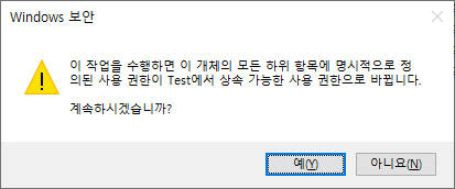 [모든 자식 개체 사용 권한 항목을 이 개체의 상속 가능한 사용 권한 항목으로 바꾸기]