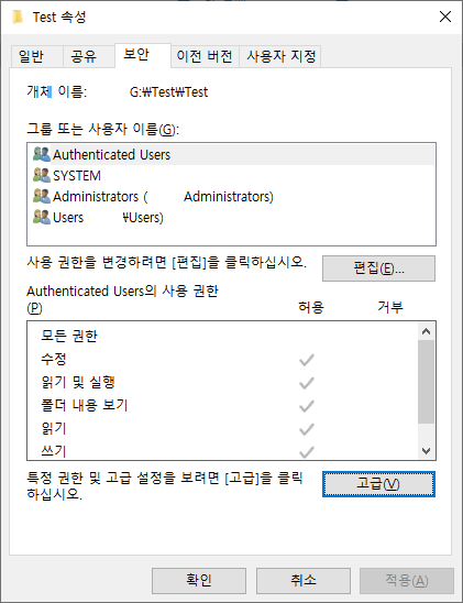 1. 폴더 혹은 파일의 [속성] - [보안] - [고급] 순서로 누릅니다
