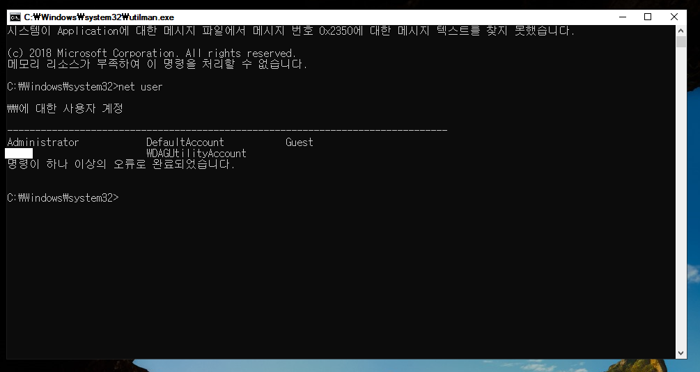net user 명령어를 실행하면 현재 등록된 사용자를 확인 하실 수 있습니다