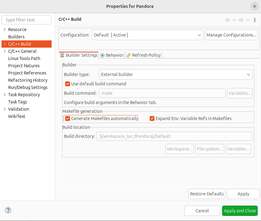 [프로젝트 속성(Properties)] -> [C/C++ Build] -> [Makefile generation] -> [Generate Makefiles automatically]