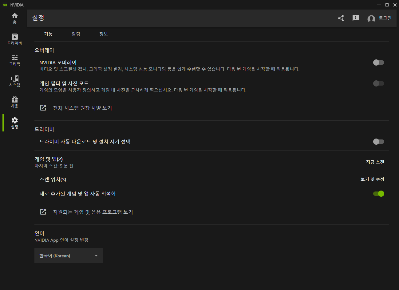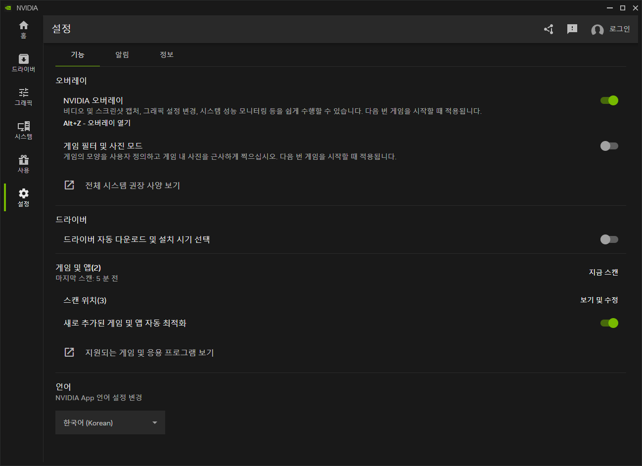 그중 NVIDIA App 프로그램을 실행하여 왼쪽 메뉴의 설정탭을 선택 그리고 상단 기능 선택 후