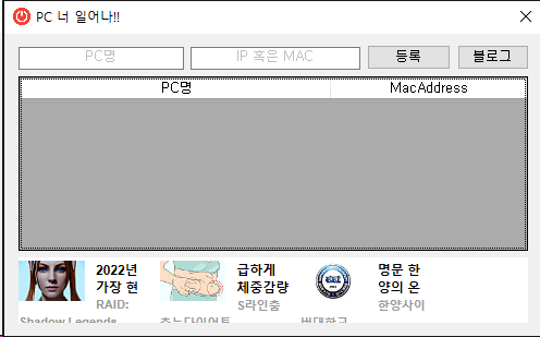 - 리스트 : 등록된 리스트 중 마우스 오른쪽 버튼으로 선택하면 PC 켜기 및 삭제를 할 수 있다