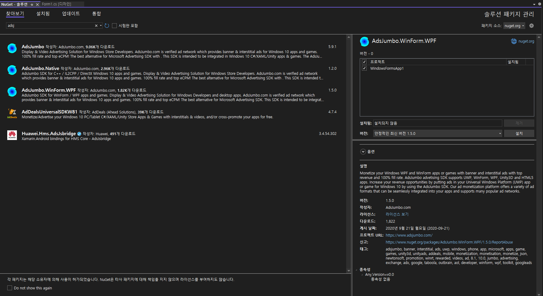 AdsJumbo.WinForm.WPF를 설치한다