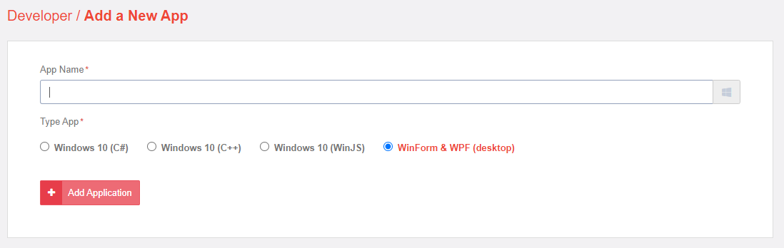 App의 이름을 입력하고 Type은 마지막에 있는 Winform & WPF (desktop) 을 선택하고