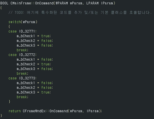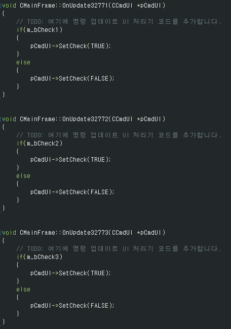 8. 메뉴에서 추가한 UPDATE_COMMAN_UI 함수에 아래와 같이 코드 추가