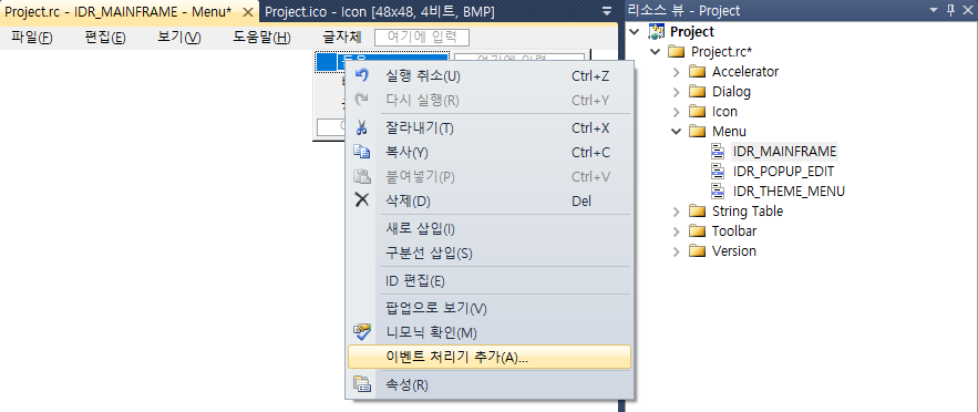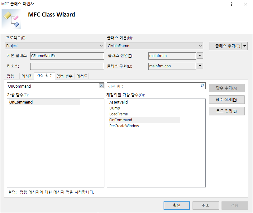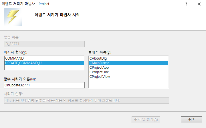 4. 이벤트 처리기 마법사에서 CMainFrame 항목으로 UPDATE_COMMAND_UI 이벤트 추가