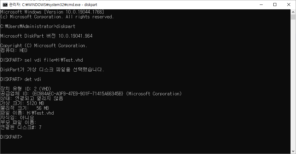 생성된 VHD 파일의 용량을 확장하기 위해서 필요한 작업입니다 DISKPART 를 통해 해당 디스크를 선택합니다   현재 테스트로 5G의 Test.vhd 파일을 생성해 둔 상태입니다   VHD 파일이 연결되어 있다면 연결을 끊고 확장 작업을 진행합니다 5G를 증가시키기 위해서는 총 디스크 크기를 아래의 명령어로 입력합니다 (현재 디스크 크기 + 추가할 디스크 크기 입력) > exp vdi maximum=10240  이후 디스크 크기를 확인하면 총 디스크 크기가 늘어난 것을 확인할 수 있습니다   이후 디스크 관리에서 볼륨 확장을 진행하면 늘린 만큼 디스크 파티션이 확장된 것을 확인할 수 있습니다  감사합니다  제 글이 도움이 되셨다면 댓글 & 공감 부탁드려요 😀