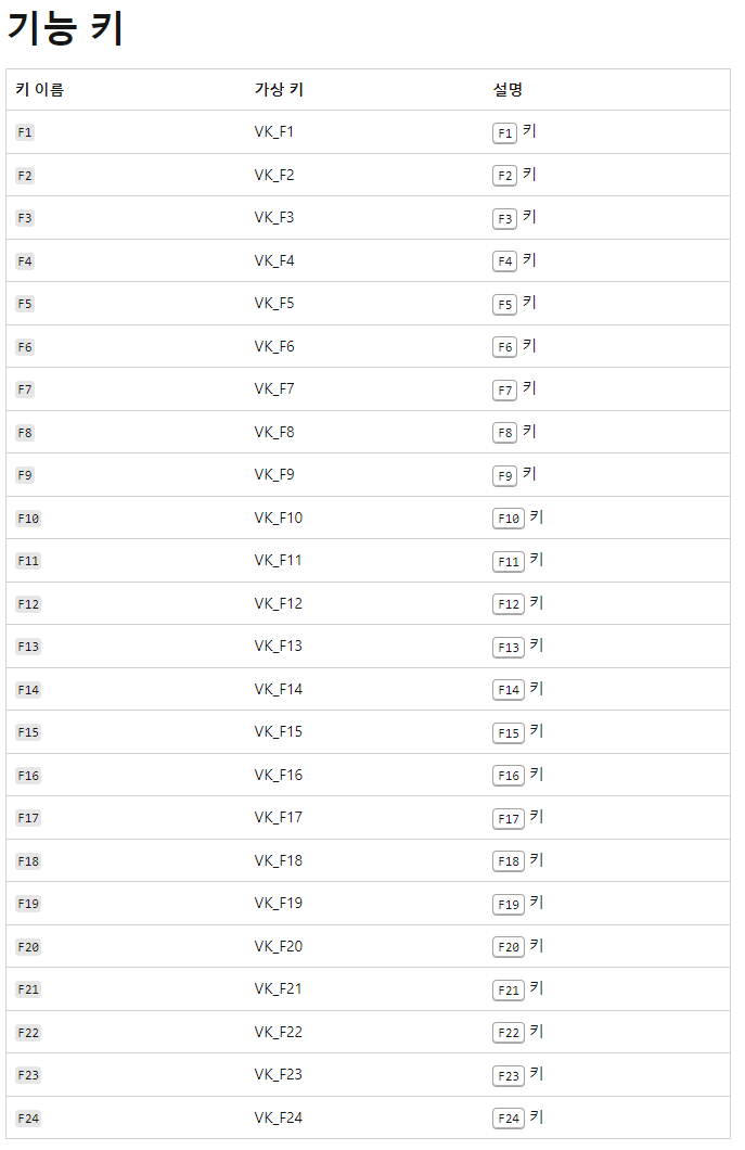 기능키가 최대 F12까지인 줄 알고 있었는데 알고 보니 윈도우에서는 F24까지 지원하는 걸 하는 걸 알았네요 잊지 않기 위해 블러그에 포스팅합니다 https://learn.microsoft.com/ko-kr/windows/iot/iot-enterprise/customize/keyboardfilter-key-names 키보드 필터 키 이름 키보드 필터 키 이름 아티클 07/22/2023 기여자 1명 피드백 이 문서의 내용 --> 키 또는 키 조합을 차단하도록 키보드 필터를 구성할 수 있습니다. 키 조합은 더하기 기호(+)로 구분된 하나 이상의 보 learn.microsoft.com 제 글이 도움이 되셨다면 댓글 & 공감 부탁드려요 😀